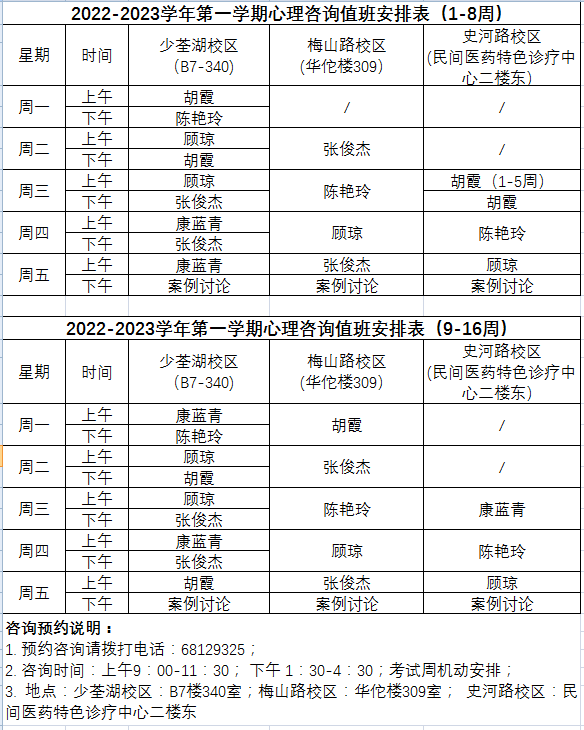 本学期心理咨询中心值班表如下,欢迎广大在校师生预约来访(少荃湖校区、梅山路校区、史河路校区同时进行)。