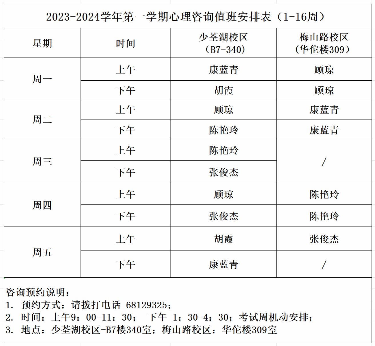 本学期心理咨询中心日常约访工作已经正式开始,欢迎广大在校师生预约来访(少荃湖校区、梅山路校区同时进行)。值班安排如下: