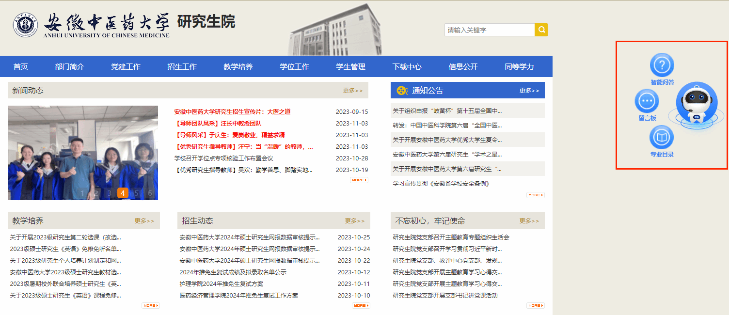 点击访问安徽中医药大学研究生院网站(https://yjsb.ahtcm.edu.cn/),如下图所示访问学校官方网站,点击招生问答功能: