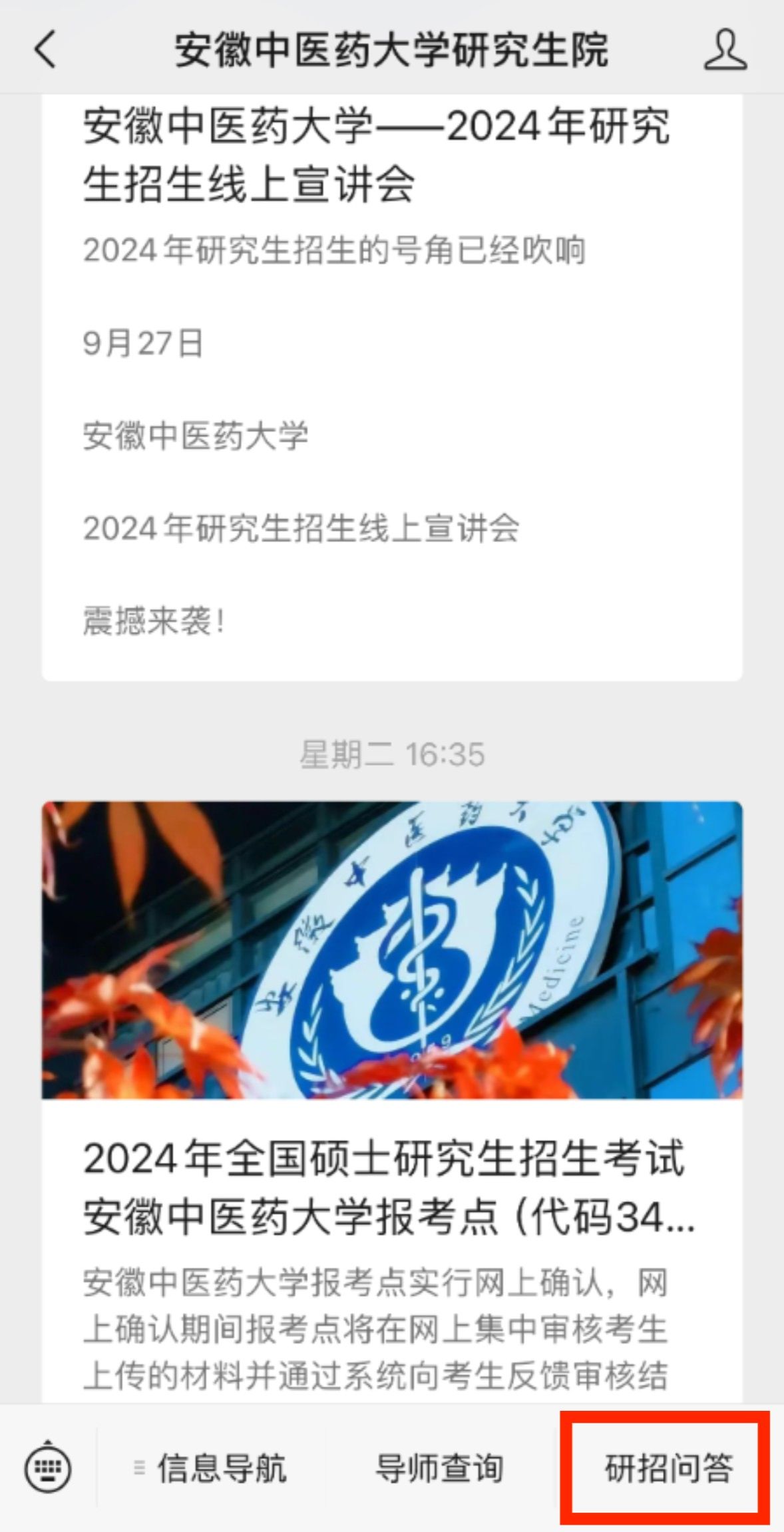 二、通过【安徽中医药大学研究生院】微信公众号访问