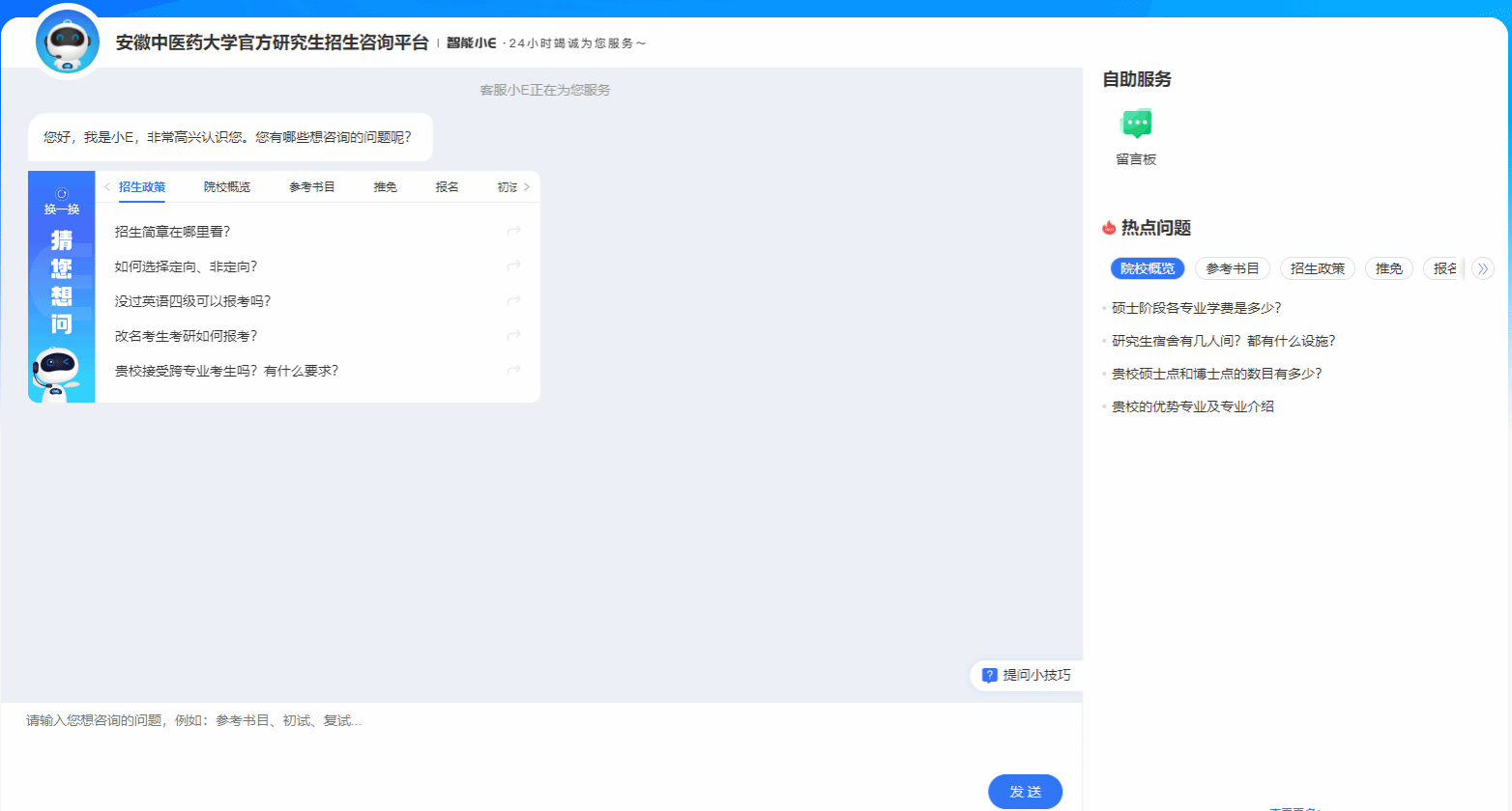 为方便广大考生了解安徽中医药大学研究生招生相关信息,确保学校研究生招生各项工作安全、平稳、有序进行,安徽中医药大学研究生院增加了线上咨询-智能问答系统(下文简称小E)。