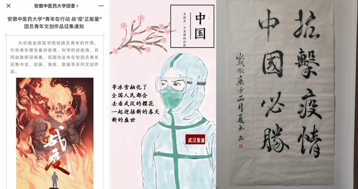 为科学普及新型冠状病毒肺炎的知识,弘扬战斗在防疫“一线”的英雄事迹,校团委以“青年在行动 战‘疫’正能量”为主题,向全校师生征集书法、绘画、海报、歌曲等文创作品,目前已收集到《国难兴邦》《抗击疫情 中国必胜》等86幅作品。2019级国际经济与贸易专业170余名同学为爱发声,从省内外不同地方录制祝福视频,为武汉加油、为中国加油,为战“疫”送去安中医最温情的祈愿。
