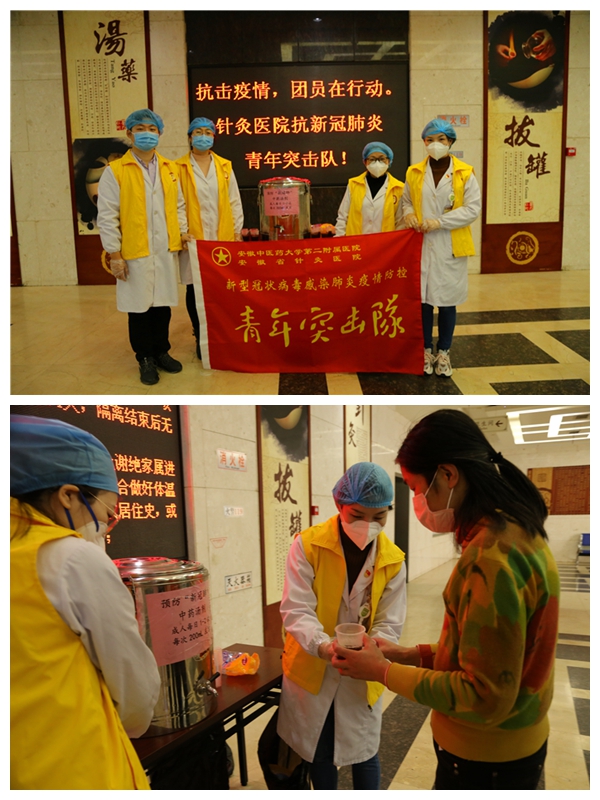 学校第二附属医院团委通过招募院内志愿者,组建了“抗疫青年突击队”,辅助开展各项工作。自2月4日至11日,每日免费向职工、患者及家属、陪护和其他进入院区的相关人员提供预防肺炎的中药汤剂,受到一致好评;紧急调配药材,与药学部共同努力,加急赶制出了5000个防病毒中药香囊,免费送到患者和家属、陪护及“抗疫”一线的医务人员和公安干警手中。