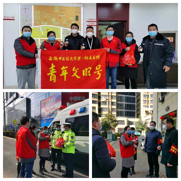 一附院中药房积极发挥“全国青年文明号”的先锋模范作用,取消所有年假,返回工作岗位,冲到药品生产一线,根据安徽省中医药学会发布的“中医药预防呼吸道传染病建议处方”,加班加点生产特色制剂--复方黄芪解毒合剂;积极深入街道、社区、交警执勤岗亭及医院发热预检、食堂、保洁等抗击病毒一线及相关保障部门,为防控值守人员送去防疫药剂,在急难险重面前,全力以赴完成特殊时期疫情防控各项工作;组建援助赴鄂人员家属先锋队,根据居住地地理位置建立一对一或一对多的定期对接,为赴鄂人员家属提供力所能及的帮助,帮助赴鄂人员形成有力的大后方。
