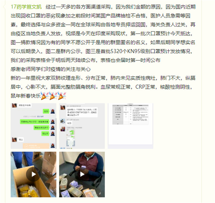 病毒无情、安中有爱。在看到防疫用品紧缺的求助后,安徽中医药大学药学院2017级药学专业的笪文凯和2017级药物制剂专业的孙凌峰、昌庆成等组织同学进行募捐,并同时线上联系武汉多家医院进行接洽,积极寻找防疫用品的海外购买渠道。经过努力,共募得善款127000余元,包含校内师生的3250元。通过善款所购N95口罩已分批定向捐赠至武汉儿童医院、武汉市第六医院、武汉市汉口医院、武钢二院等疫区医院。3位同学表示:“也许我们只是杯水车薪,不过我们不会因为力量小就放弃,也相信只要我们全国人民团结一心,一定能够战胜疫情!。”