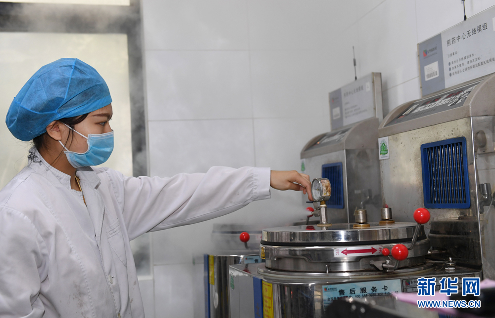 2月21日,在安徽中医药大学第一附属医院煎药室,中药师左虹艳正在设定压力,及时关注煎药的进度。
