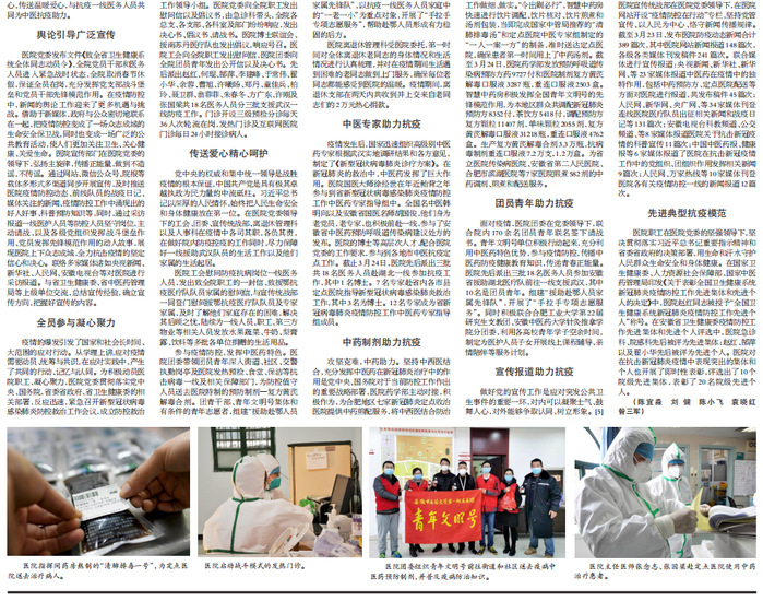 统筹工会、团委、宣传统战部、人事科及离退休管理科等部门职能,紧密凝聚职工人心,传送温暖爱心,与抗疫一线医务人员共同为中医抗疫助力。