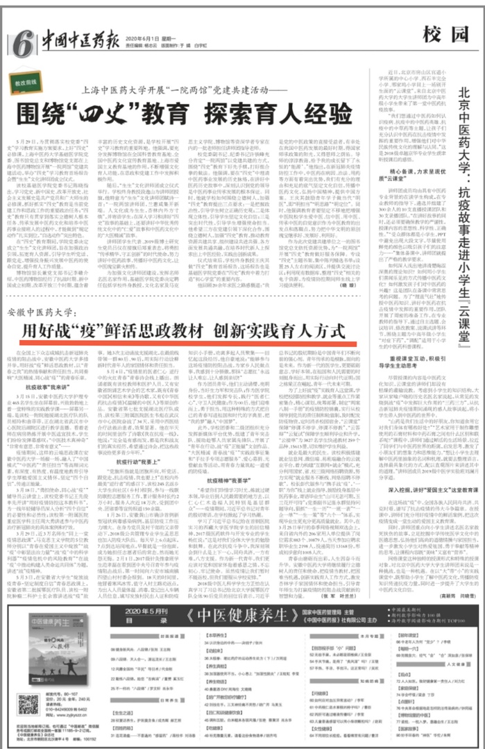 在全国上下众志成城抗击新冠肺炎疫情的阻击战中,安徽中医药大学多措并举,用好战“疫”鲜活思政教材,以“青春之我”的热情奉献和责任担当,共同奏响“大医精诚、同心战‘疫’”的青春乐章。