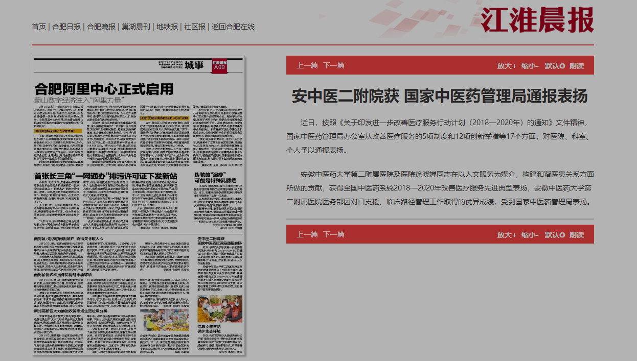 安徽中医药大学第二附属医院及医院徐晓婵同志在以人文服务为媒介,构建和谐医患关系方面所做的贡献,获得全国中医药系统2018—2020年改善医疗服务先进典型表扬,安徽中医药大学第二附属医院医务部因对口支援、临床路径管理工作取得的优异成绩,受到国家中医药管理局表扬。