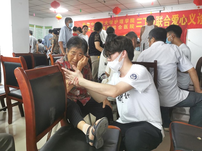活动现场,由护理学院党委书记吴成长、安徽省中西医结合医院副主任医师孔令洋、主治医师卢尹凤以及护理学院王杰老师为居民进行义诊,并解答他们日常生活中遇到的健康问题,指导他们合理膳食、合理锻炼、定期体检。青年志愿者们为前来咨询的居民免费测量血压、血糖,询问近期血压控制情况及日常用药情况,此外还为居民提供按摩推拿、中医茶饮等服务。师生一行耐心细致、热情周到的服务收获了三十头社区乡亲们的一致好评。