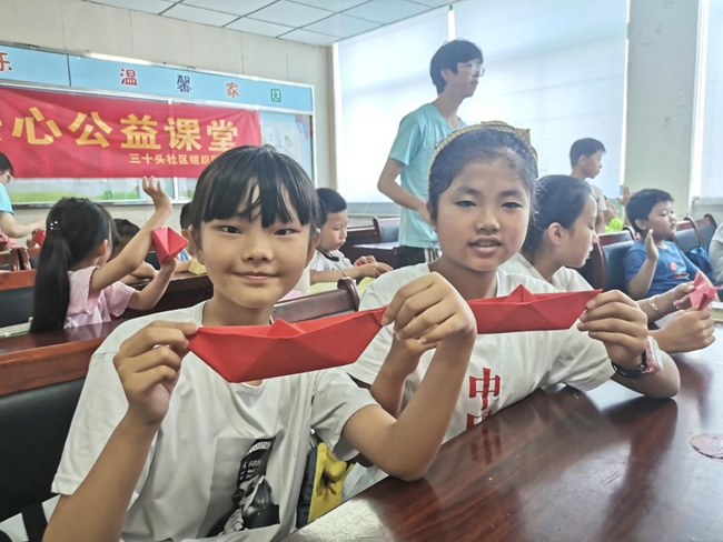 14日上午,活动继续在三十头社居委展开,通过三十头社区社会组织联合会主办的乐暑安心公益课堂,大学生志愿者为留守儿童讲述红色英雄故事,并带着孩子们开展了“绘理想蓝图”、“折只红船献给党”等活动,孩子们通过自己纯真的方式向党献上最诚挚的敬意。当一个个稚嫩的声音说出军人、医生、宇航员这样不平凡的梦想,相信“请党放心,强国有我”的誓言一定能在不远的将来实现。