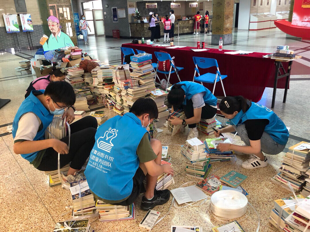 图为志愿者们努力打包整理书籍。中国青年网通讯员 刘涛 供图