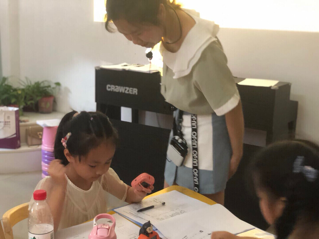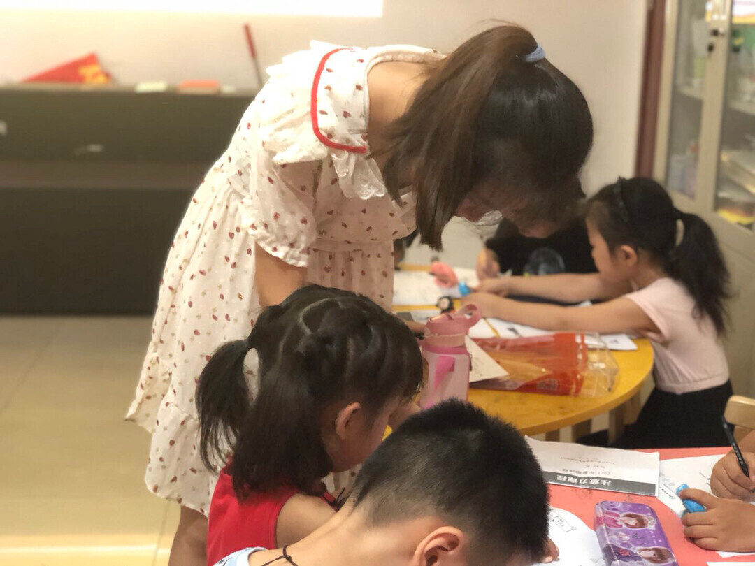 图为志愿者在检查儿童作业。中国青年网通讯员 刘涛 供图