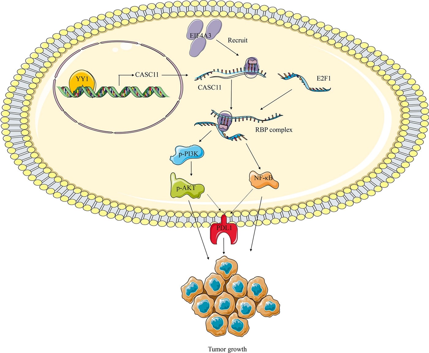 蔡标教授、宋航博士团队在HCC患者组织中发现CASC11显著上调,并且与病人的不良预后相关。进一步的研究发现抑制CASC11的表达可抑制HCC细胞的增殖、迁移,降低糖代谢水平,并促进细胞凋亡。机制研究表明,CASC11可通过结合EIF4A3蛋白增强E2F1 mRNA的稳定性,进而调控下游NF-κB信号通路、PI3K/AKT/mTOR通路和免疫治疗重要靶点PD-L1蛋白的表达。此外,该团队还发现转录因子YY1可以通过与CASC11的启动子结合调节其表达。提示了CASC11是治疗HCC的重要靶点。