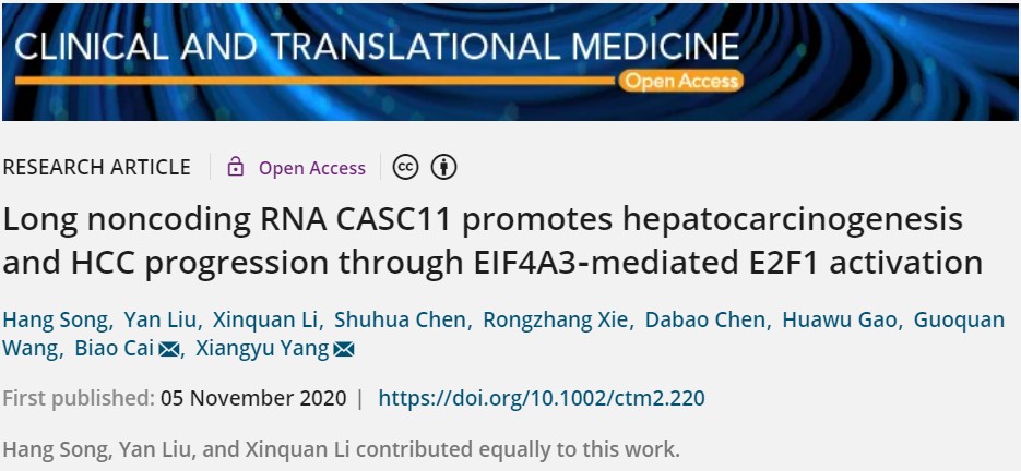 近日,安徽中医药大学蔡标教授、宋航博士团队与中科院苏州医工所,首都医科大学在医学领域著名杂志Clinical and Translational Medicine (IF=7.919) 发表题为“Long noncoding RNA CASC11 promotes hepatocarcinogenesis and HCC progression through EIF4A3‐mediated E2F1 activation ”的研究论文,中西医结合学院宋航博士为论文的第一作者,2018级微生物与生化药学专业硕士研究生黎鑫权为论文的共同第一作者之一,蔡标教授为论文的第一通讯作者,安徽中医药大学为本论文的第一单位。