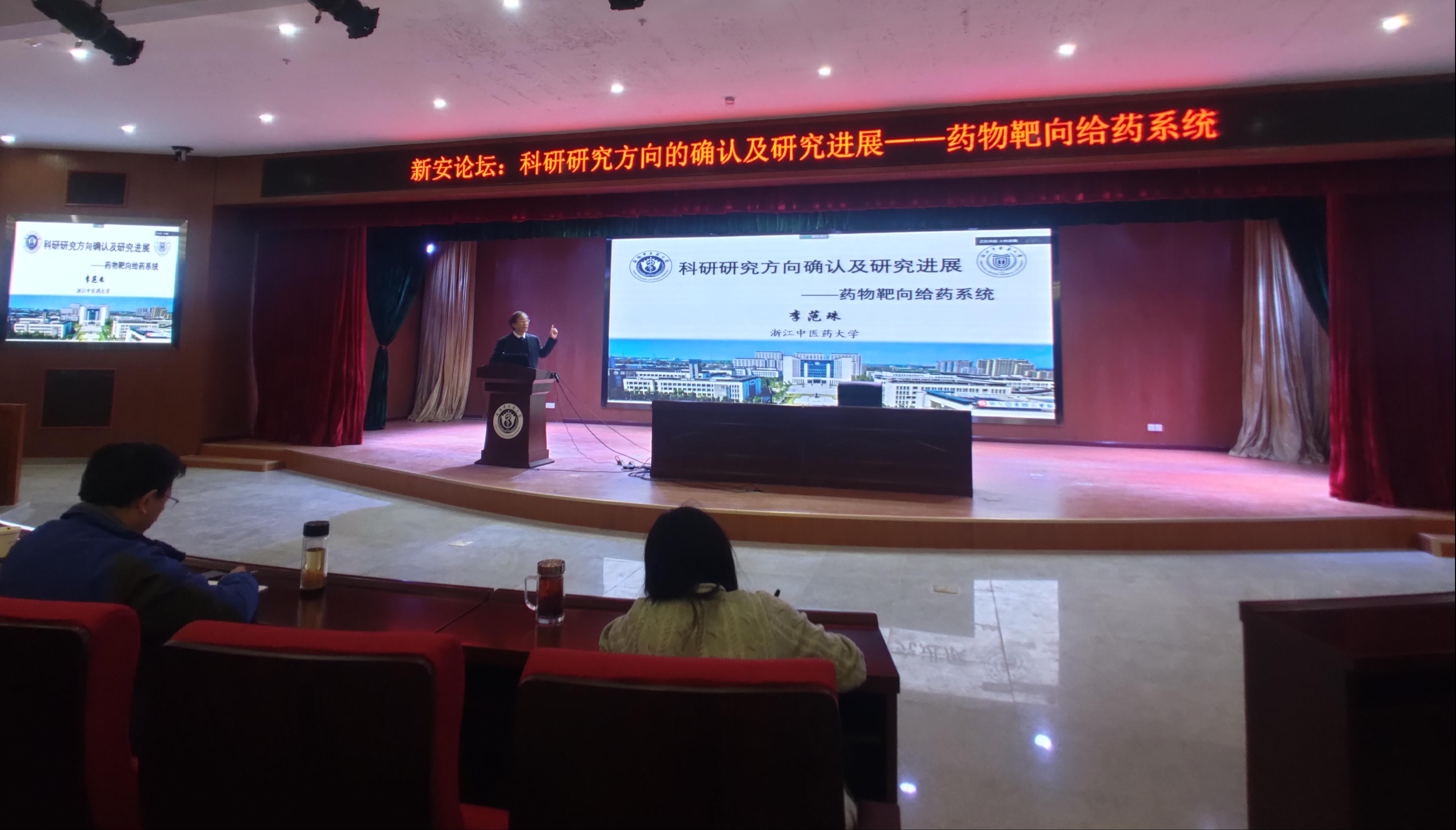 11月30日下午,浙江中医药大学中医药科学院副院长,国家中医药管理局“中药制剂重点学科”负责人,浙江省一流学科药学学科负责人李范珠教授应邀来校作“科研研究方向的确认及研究进展——药物靶向给药系统”讲座。报告会由药学院院长桂双英教授主持,报告会线上线下相结合举行,线下有药学院及其他学院老师、博士与硕士研究生等150余人参加了会议。