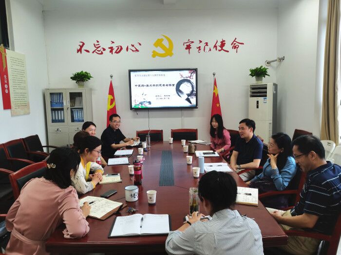 杨硕鹏以“中医药+美术学的思考与探索”为主题,与各位老师就“中医药健康养生文化的哲学基础”、“书画艺术的养生功能”、“《本草图经》药图的考证”、“医艺相通——中医学与中国传统书画的契合性”等四个方面从宏观到微观进行了逐步探讨,最后落实到中医药文化与美育的交叉融合上面,针对公共艺术课程教学、艺术俱乐部改革、期末汇报演出等相关问题进行了详细讨论。