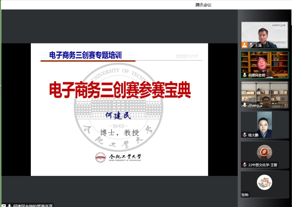 何建民在讲座中围绕“创新创业大创竞赛”“电子商务与三创赛的关系”“选题参赛锻造能力”“获奖项目评审精要”等环节进行详细解读。在线上互动交流环节中,同学们踊跃互动,提出自己的困惑与问题,何建民老师一一给予了精准的解答和深入的沟通指导。
