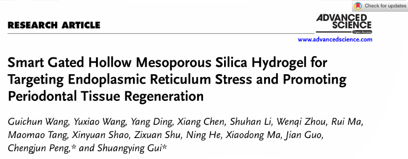 近日,我校药学院桂双英教授、彭成军副教授团队在国际知名综合性期刊《Advanced Science》(中科院1区TOP,IF=14.3)在线发表题为“Smart Gated Hollow Mesoporous Silica Hydrogel for Targeting Endoplasmic Reticulum Stress and Promoting Periodontal Tissue Regeneration”的研究性论文,2024级博士生王桂春、2023级博士生王雨宵、丁杨为共同第一作者,安徽中医药大学为唯一通讯作者单位。