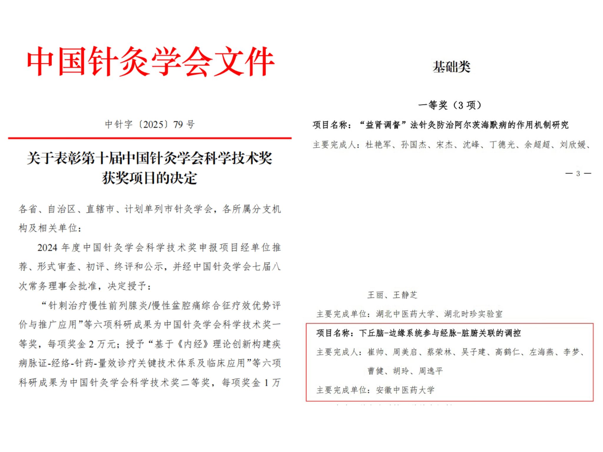 11月24日,中国针灸学会正式公布了第十届科学技术奖评选结果,我校针灸经络研究所、经脉脏腑相关安徽省重点实验室的研究项目“下丘脑-边缘系统参与经脉-脏腑关联的调控”荣获基础类一等奖,实现了学校在该权威奖项上的历史性突破。