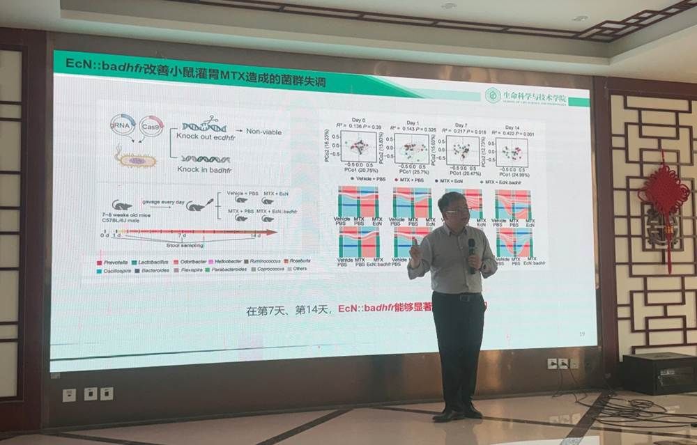 李菁教授从药物引发肠道菌群紊乱的临床问题出发,深入浅出地剖析了工程益生菌的设计原理与调控机制。他重点阐述了如何利用蛋白同源性竞争结合策略,改造益生菌以精准靶向药物-菌群相互作用位点,从而缓解药物对肠道微生态的干扰;同时结合团队近五年的研究成果,详细介绍了微生物作用蛋白靶标的预测计算、体内外验证体系及在改善药物相关性肠道损伤中的应用前景。报告内容兼具理论深度与实践价值,为中医药与微生态学科的交叉研究提供了全新思路。