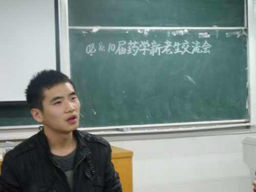 11月2日,药学院按照专业的不同,举办新老生交流会,首先是2010级药学与08级药学专业的交流会,在杏林楼101教室举行新老生交流会。邀请到08药学的刘伟、王魁麟、张凤、张柳几位同学,2010级药学全体同学参加。