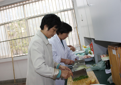 参赛的教师们纷纷亮出拿手厨艺。在包包子环节中,各位选手分别调制了萝卜肉馅、白菜肉馅和葱肉馅,并在规定的时间内完成了擀皮儿、包包子等多道工序,包出的包子造型精美,口味鲜香;土豆炒肉丝环节中各位老师根据自己的烹饪特色炒出了不同的味道,现场气氛热烈;工会委员和部分教师组成的评委们十分认真,他们一边品评各道菜的色、相、味、形,一边倾听参赛教师对自己的菜进行1分钟的营养介绍。教师们开心品尝,热切评议。经过一番激烈角逐,最后一致推荐徐建军老师参加包包子比赛,谢晓梅老师参加土豆炒肉丝比赛。