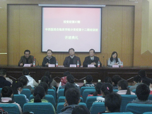 经学校党委组织部批准,11月17日晚,校第37期党校中西医结合临床学院分党校培训班开班典礼在学术报告厅举行,学校纪委书记、校党校校长刘新跃,校组织部部长王道和,该院特邀党建组织员陈昌元,该院党总支书记吴成长、党总支副书记顾义俊及各支部书记、各年级辅导员出席开班典礼,典礼由吴成长主持。
