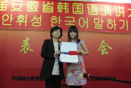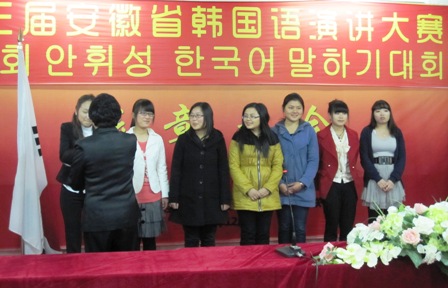 12月7日,“第三届安徽省韩国语演讲大赛”在合肥学院举行。安徽省教育厅外事处,韩国顺天乡大学、韩国韩大文化交流有限公司有关领导,省内高校代表出席活动。 本次大赛由合肥学院和韩国顺天乡大学承办、韩大文化交流有限公司协办。     我校针灸骨伤临床学院06级针灸推拿(涉外)专业孟琼同学和医药信息工程学院09级计算机科学与技术专业熊枫同学,参加了比赛。来自省内9高校的19名选手通过中韩文化的差异比较,表达了对中韩两国友谊的美好期望。经过对选手演讲内容、发音、态度、语法及观众反映五个方面的综合评比,我校熊枫、孟琼同学分别获得内容奖及鼓励奖。(交流学院/供稿 吴成海/编审)