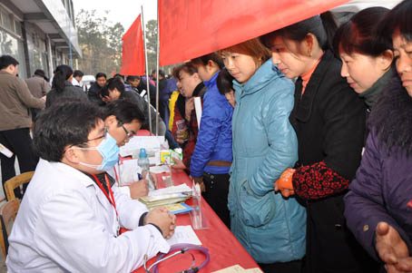 12月9日,桐城市新渡镇政府广场人山人海,热闹非凡。2011年安徽省“三下乡”活动启动仪式在这里隆重举行。一附院党委副书记彭长林率领耳鼻喉、骨伤、心血管等科室的专家,带着药品和健康科普读物,现场为参加活动的群众提供义诊咨询,健康教育等服务。