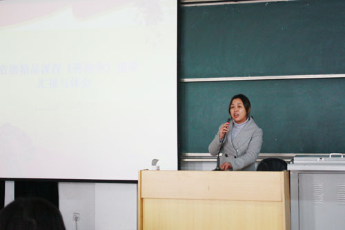 药物制剂教研室主任、省级教学名师胡容峰,汇报了省级精品课程《药剂学》建设情况与体会。她介绍了教研室师资力量,教师教材编写情况,近年来教师获奖、参加学术科研活动情况,以及教研室质量工程项目申报及获奖情况。并对研究室建设、实验室改造、团队建设、多媒体课件建设等方面做了介绍。汇报中,她着重强调了团队精神在课程、学科建设中的重要性,对于打造积极向上的团队谈了自己的体会。