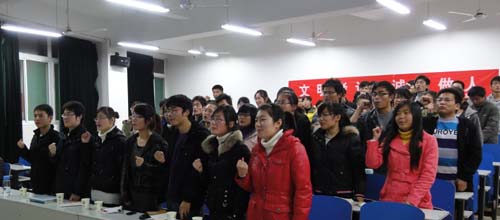 该班班干部带头宣读了“四提倡”、“四反对”、“四不准”,全体同学庄重宣誓:“诚实守信、文明做人、勤奋好学、严格自律、严肃考风、不辱班风”。