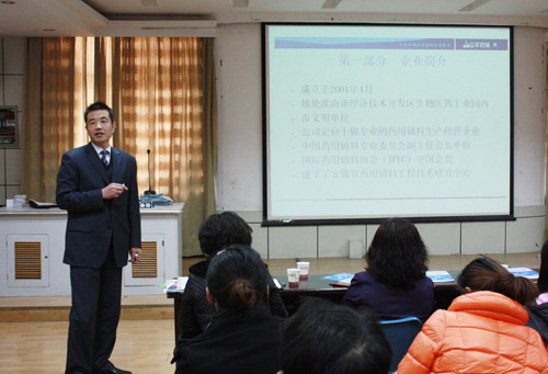 此次研讨会邀请到国际药用辅料网运营总监施拥俊先生、安徽山河药用辅料股份有限公司董事长尹正龙、德国美剂乐集团上海代表处技术经理、湖州展望药业有限公司技术部长、博爱新开源制药股份有限公司高级研究员、上海风泓医药科技有限公司销售经理等多位国内外辅料专家做主题报告,重点突出新辅料的应用和案例分享。其中,尹正龙是以校友和辅料专家双重身份为现场听众介绍企业概况、理念及崩解剂的应用等内容,受到热烈欢迎。