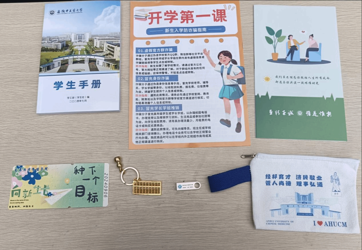 学院为每位新生准备了精美的新生礼包,内含象征经管的算盘和中医药的葫芦钥匙扣、播撒希望的种子卡片和定制优盘。让新生们感受到学院的关爱,更加认真度过大学生活。