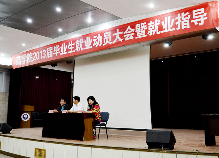 10月11日晚,药学院隆重举行2013届毕业生就业动员大会暨就业指导,校招生与就业处副处长孟庆全,药学院党总支副书记张亚辉、就业秘书孙黎及2013届全体毕业生参会。