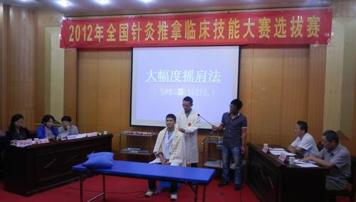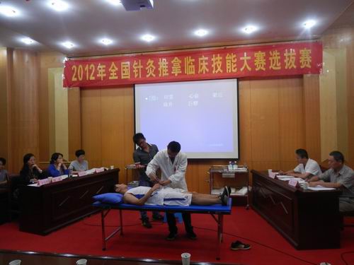 10月10日下午, 针灸骨伤临床学院在东区学术报告厅举行了全国针灸推拿临床技能大赛选拔赛。本次比赛由该院院长胡玲、副院长唐巍担任仲裁,第二附属医院副院长曹奕、一附院推拿科主任吕子萌,针灸骨伤临床学院针灸教研室主任张庆萍、针灸文献教研室主任牛淑平、针灸基础教研室主任陈卫华担任评委。该院党总支书记杜明、副书记翟从永以及该院全体老师出席了本次比赛。
