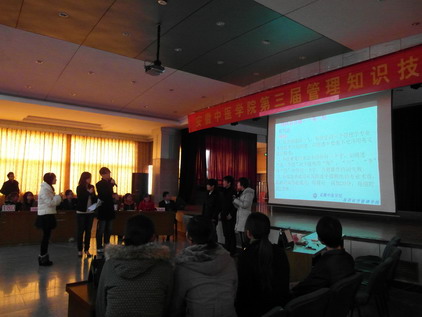 12月12日下午,我校第三届管理知识技能竞赛决赛在西区多功能厅举行。校教务处处长储全根教授出席并致辞,经管学院党政领导、各教研室主任、管理学科的全体教师、辅导员出席并与300多名学生一起观摩了比赛。