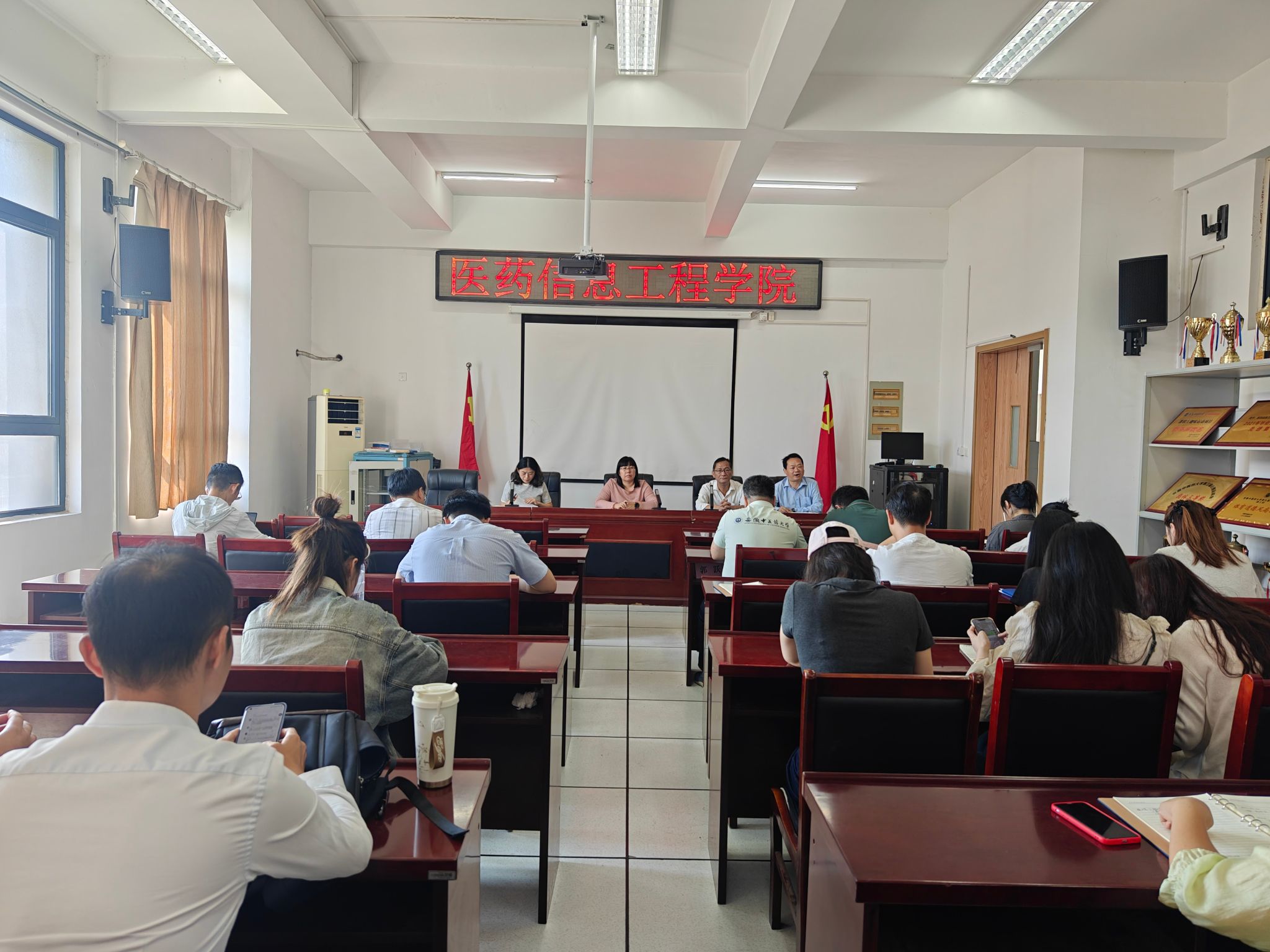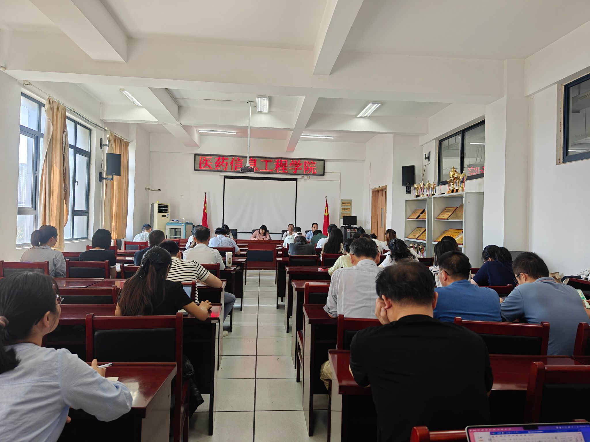为进一步贯彻落实全国教育大会精神,大力弘扬教育家精神,加强师德师风建设,严格纪律要求,9月25日,医药信息工程学院召开教职工大会,开展集中政治理论学习。学院党政领导班子及全体教职工参加会议,会议由学院党委书记高霞主持。