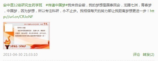 为响应团中央学校部号召,4月28日,12级研究生药学班团支部动员全体同学,紧紧围绕“青春中国志,放飞中国梦”的主题,结合雅安地震的时事,心系雅安,积极开展“青春国梦,祈福雅安,放飞梦想”系列活动。