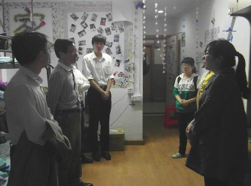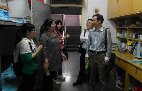 为深入了解学生的学习生活情况,加强学生宿舍安全卫生教育。5月5日下午,经管学院党总支书记吴成海、副书记黄学武带领该院全体辅导员,深入宿舍看望学生,检查学生宿舍卫生安全情况。