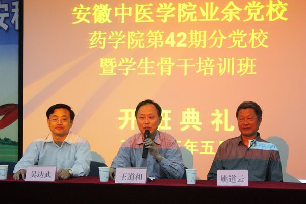 5月6日晚,药学院分党校第42期入党积极分子暨学生骨干培训班在西区学术报告厅正式开班,学校党委组织部部长、党校副校长王道和,党委组织部副部长姚为久、组织员周其艳,特邀党建组织员姚道云以及药学院党总支书记吴达武、党总支秘书金晓琴出席仪式。会议由吴达武主持。