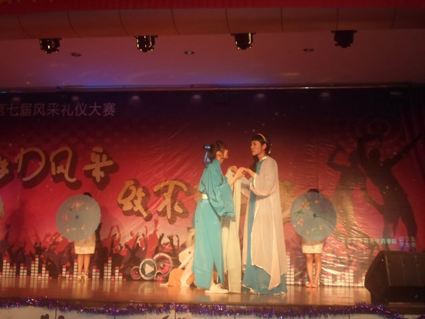 在华美的舞台上,选手们以绚丽的舞姿、动人的歌曲、深情的朗诵、神奇的魔术、幽默感人的话剧等形式,为观众呈现了一场精彩绝伦的艺术盛宴。相声表演《你幸福吗》让观众在开怀大笑的同时思考人生幸福的意义;歌舞表演《UUU》彰显了青春的魅力多彩;话剧表演《我们爱的好辛苦》轻松幽默,笑翻全场;傣族舞蹈表演《月光下的凤尾竹》让观众看到了中国少数民族文化的瑰丽。在欢笑中感动,在感动中深思,在深思中升华,这就是风采礼仪的魅力,也是安中学子的魅力。比赛中还为药学院在学校第二十届田径运动会中表现突出的男女运动员代表、班级、啦啦队进行了颁奖。