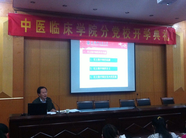 10月23日晚,中医临床学院分党校第十九期培训班举行开班典礼。校特邀党建组织员黄笃法,组织部部长王道和、组织员周其艳和学院党总支书记董昌武、院长王茎、党总支副书记况执本、副院长陆翔出席了典礼。