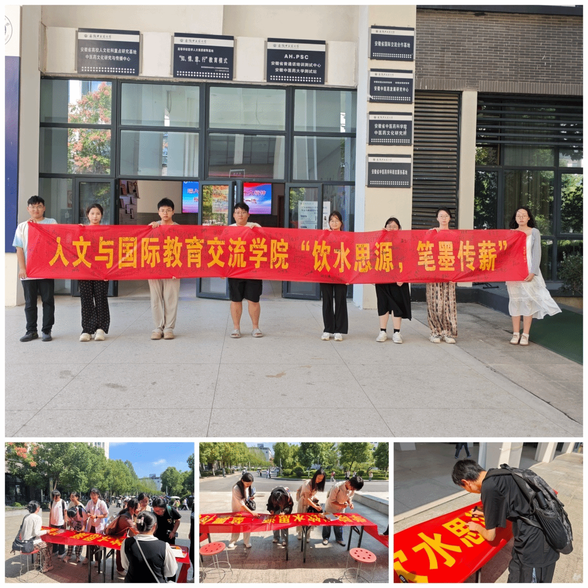 以作品致初心,礼赞祖国华诞。学院面向人文与国际教育交流学院全体学生,在线上开展了“饮水思源,笔墨传薪”文学作品、书画影像征集活动,在线下开展了宣传摆台以及签名宣誓活动。