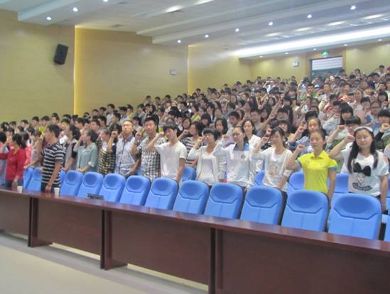“坚定理想信念、练就过硬本领、勇于创新创造、矢志艰苦奋斗、锤炼高尚品质、争做杰出人才!”开学典礼在全体2014级新生庄严的宣誓中,圆满落幕。(沈晨/报道)