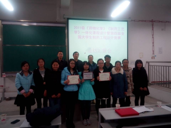 获得第四届全国大学生制药工程设计竞赛优胜奖的廖路敏和范茜茜同学代表各自团队向同学们展示了他们的竞赛作品,11级制药工程全体同学分23组在李家明和李传润两位老师的指导下,根据不同的设计任务要求,分组进行相关药物化学-制药工艺一体化程设计,通过查阅文献,就相关药物研究背景,药物合成的工艺,物料能量衡算,化工设备选择,工艺设备流程等,制作了PPT进行汇报。