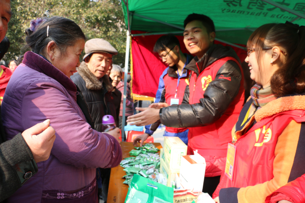 温暖进社区,志愿者齐行动。为了在寒冷的冬季给社区居民们送去温暖与关爱,普及中医药学常识,2014年12月27日,药学院学生会携手华佗爱心社、大学生推拿学社在合肥市皖江小区开展了“创建全国文明城市 志愿者在行动”义务活动。
