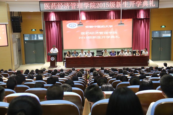 9月14日下午,安徽中医药大学医药经济管理学院隆重举行2015级新生开学典礼。学院党总支书记吴成海、院长魏骅、党总支副书记黄学武、副院长丰志培,各教研室主任、教师代表、全体辅导员以及410名新生参加了典礼。会议由黄学武主持。