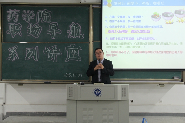 10月27日晚上,药学院在A110教室开展了以“制药人,机遇下一站路口”为主题的职场导航讲座。本次讲座邀请到了扬子江药业集团海蓉公司总经理、04届药学专业杰出校友梁文为先生,讲座由药学院党总支副书记金晓琴老师主持。