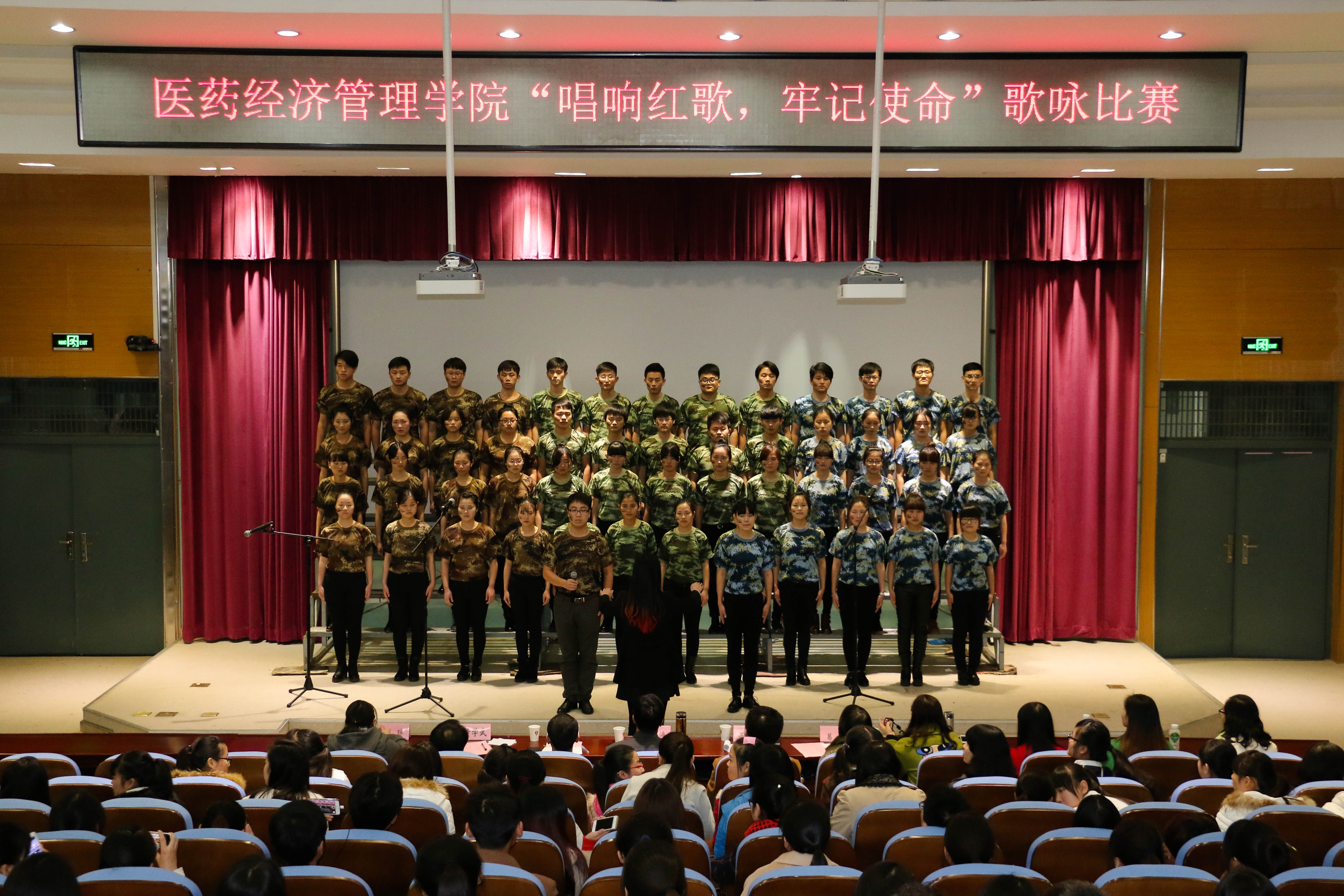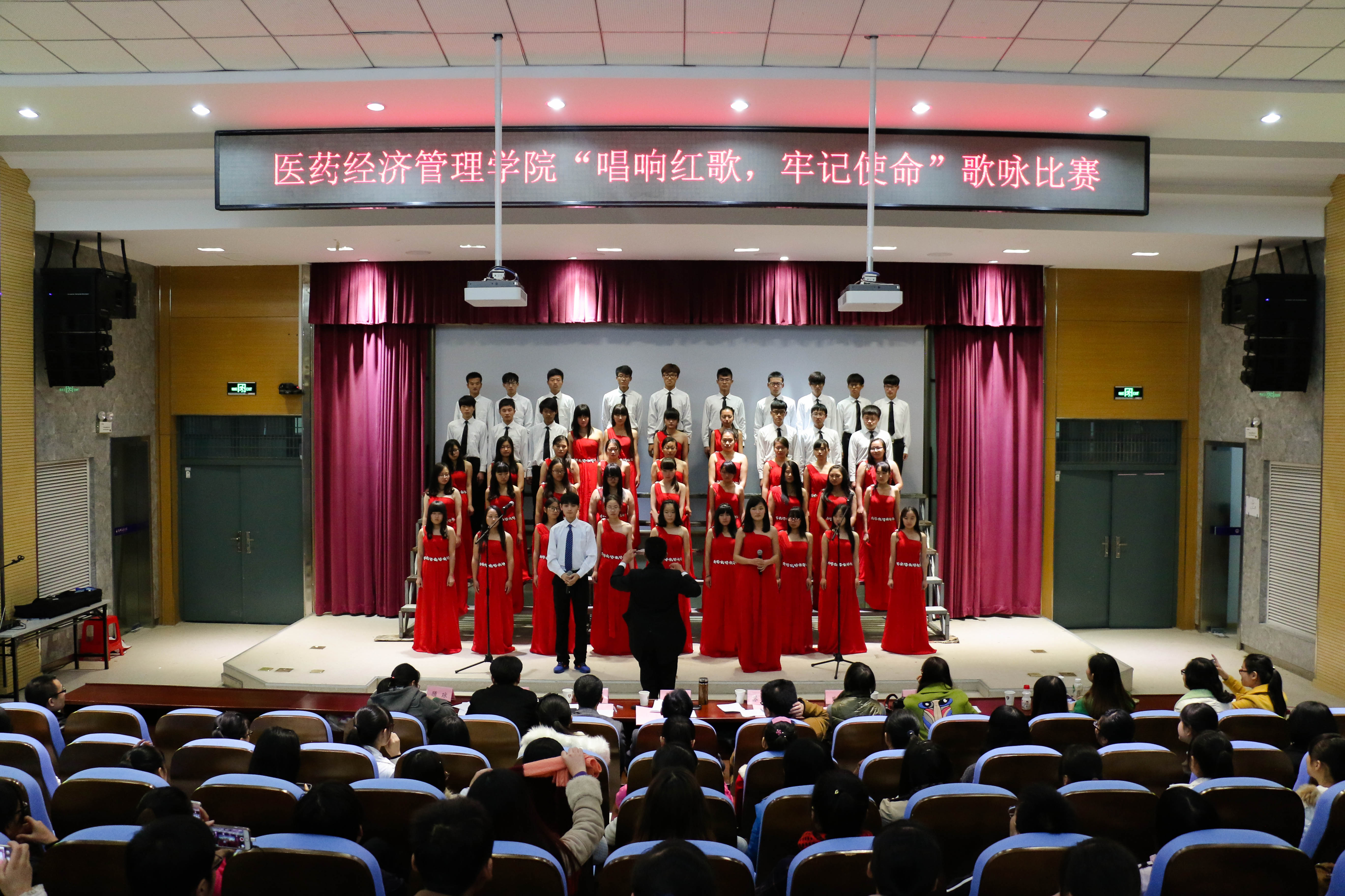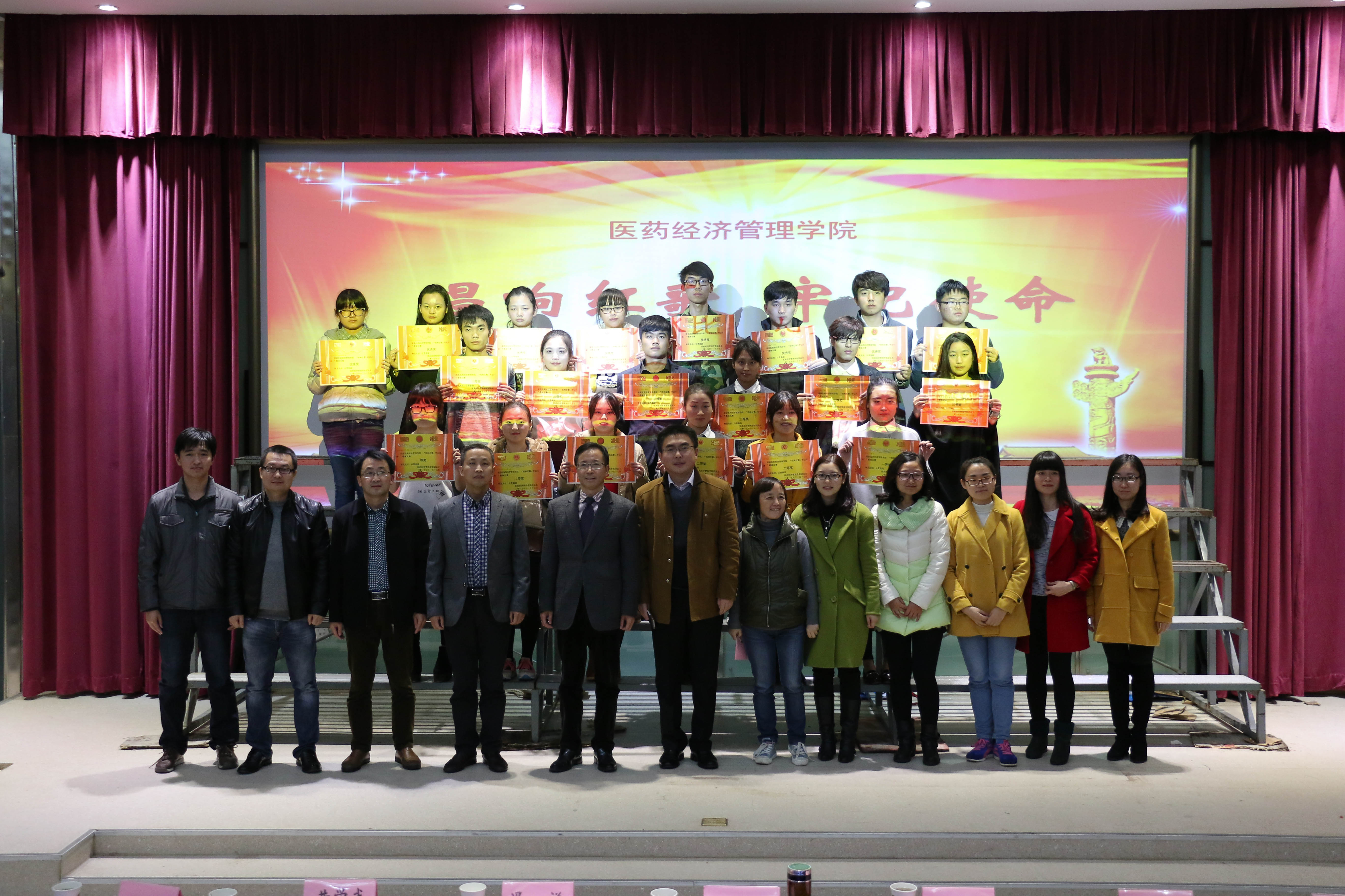 为隆重纪念中国人民抗日战争和世界反法西斯战争胜利70周年,深切缅怀抗战英烈的丰功伟绩,积极传承抗战英烈的家国情怀,努力实践伟大复兴的中国梦。11月17日晚,医药经济管理学院举办“唱响红歌 牢记使命”大学生歌咏比赛。学院党总支书记吴成海、校学生处副处长冯祥、校团委副书记苏本江,学院党总支副书记黄学武、工会主席葛卫和全体辅导员一起观看歌咏比赛。